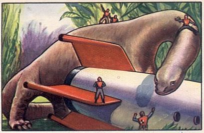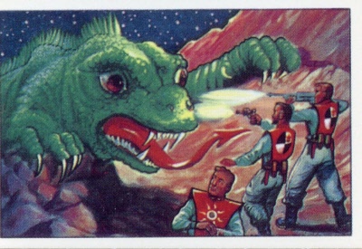 The dramatic cards hit the market in 1951 in both 1 and 5 cent packs. They were a sensation among kids. The story followed the adventures of the Rocketship 6X52 crew as they left the rocket center in Manhattan and traveled to the moon, Mercury, Mars, and many other planets. Unlike the tedious time-delayed transmissions that came from the real-life Apollo missions, reports from the 6X52 were always action packed. The crew was never bored by the monotony of space travel or visiting lifeless worlds. They sped from planet to planet without growing old and barely had time to sleep! Astro-pirates, Meteorite showers, and even giant space blobs menaced them between destinations. Landing the ship rarely made them any safer. Back in the 1950s, every planet and moon was teaming with life and most of it was hazardous to humans! Where are the aliens now, you ask? Perhaps extraterrestrial life was killed off by germs introduced by the 6X52 crew, 'coz in 1951, space creatures were abundant and it was the crew who were endangered.