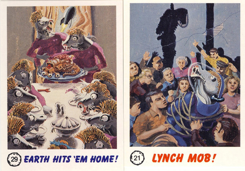 Ting downplays the success of his series. "If it weren't for the price guide, I doubt if anyone would even remember this thing." I would personally disagree, although it's true that I first found out about the series in the 1990 Chris Benjamin Price Guide. But once I saw it in there and read Benjamin's glowing review of it, I knew I had to get one for myself. The only problem was how? I didn't know about The Wrapper back then, and eBay didn't exist. So I called card shop after card shop until I finally tracked a set down in San Jose. I drove the hour or so to get there and bought it on the spot. I wasn't disappointed with my purchase, either. The four-armed aliens were really cool, and the tongue-in-cheek humor was pretty funny, especially when juxtaposed with the bloody violence. The backs included stories, puzzles and photos of upcoming cards, just like Mars Attacks. It was a great addition to the actual Topps set (of which I had a reprint of at that time).