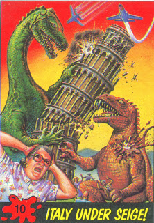 "Italy Under Seige (misspelled #10), that lady is Phillie from our mail room. We even worked in cameo appearances of real movie dinosaurs. In that particular image, you've got The Giant Behemoth pushing the leaning tower of Pisa over The Beast of 20,000 Fathoms. So like Roger Rabbit, I would sneak some recognizable dinosaurs into the mix."