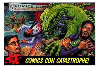 Then again, maybe I'm biased. I have a special affinity for this set, and there hangs a tale. Back in the late 1980s, I was attending University in Alabama when I first saw some Dinosaurs Attack cards. I thought they were fantastic. They reminded me of the Mars Attacks series that an artist friend had introduced me to in California. I decided to return the favor and introduce him to Dinosaurs Attack. I bought an entire box and shipped it to him. I included a letter saying I thought they were one of the best sets ever, and asked if he had ever heard of them before. He never wrote back. I finally called him and asked why he didn't answer my letter. He responded, "I thought you were kidding. Of course I have heard of them. I was one of the artists!"
