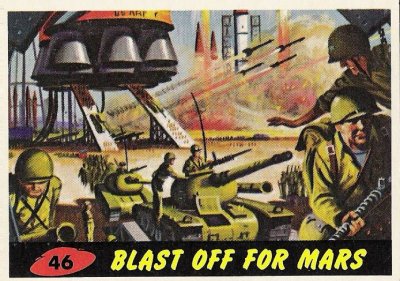 #46, Blast Off For Mars. This exciting card shows Earth’s armies filling up numerous rocket ships with tanks, bombs, and troops, for a counter attack on Mars. It’s about time we take the war to them! There’s only one problem... In 1962, we hadn’t even landed on the moon yet, and just hauling three guys there would prove to be a major undertaking for years to come. Fifty years later, we still haven’t put a man on Mars, and if we ever do, NASA says we would probably need to send a robot instead, in order to save on all the weight that their food and other supplies would require in fuel. In other words, if we ever are able to go to Mars, it will be only one ship at a time, with room for only one or two people (or robots), but no large crew. The notion that we would happen to have a fleet of such rockets ready to haul “tanks, guns, rocket-planes and soldiers” to Mars is laughable indeed, especially when it was our first flight to a distant planet.