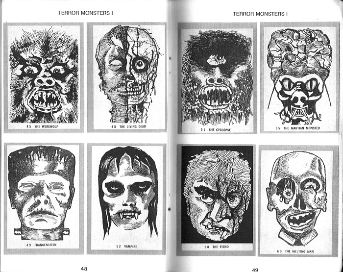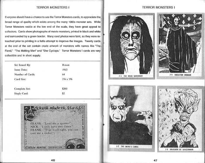 Here's another late edition-- this one is pretty embarrassing, because it's one of my favorites. How could I have forgotten about it until now? I guess I had it buried somewhere under the pile! And besides, it's more like a picture catalog than anything else, filled mostly with LOTS of pictures! And it only covers a very specific niche; monster cards from the 1960s. It's called Nonsports Illustrated and it's basically a zine. Does it give prices? Sure, but only for the 18 monster sets from that decade. I ordered my directly from author Miles Russel from an ad in The Wrapper magazine. We later became friends and I ended up buying most my Terror Tales cards from him. (Thanks Miles!) The soft cover booklet measures 5.5 x 8.5" and is 72 pages long, mostly filled with black and white photos showing sample card fronts. There's also a brief paragraph summery of each set in the upper half of one page, then 2 1/2 more pages filled with (usually 12) card images. Is it a major accomplishment of research? Nah, it was probably the easiest book of the bunch to write. But it also has the most charm. I haven't seen it for sale in decades and it was originally published way back in June 1991. It says "Volume 1", but I'm almost certain no other issues were published. But if you can find one, grab it!