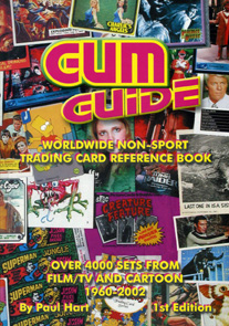 2002 brought the release of the Gum Guide by Paul Hart of England. The 127 page guide measures 5.75" x 8.25" and boasts listings of "over 4,000 sets from film/TV and cartoons from 1960 - 2002". It included 100 color photos in an eight page insert. The rest of the listings had no photos or editorial, but was laid out more like a spreadsheet indexing the set name, company, card size and number in the set, the date of issue, and the price (in both US dollars and UK pounds). This guide is especially useful in finding foreign sets of interest, as it included both US, UK, Australia and Europe. There are even many food issues listed. A second edition was also published in 2004, and it lists over 5,000 sets, adding promos and chase cards to the mix. Paul intends a future edition as well.