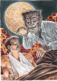 * One of 123 original story-board sketches drawn by Kuersteiner. These give a "behind the scenes" glimpse into the making of the card series. They show what Kuersteiner originally envisioned and what Garijo ultimately provided. Sometimes the two images are very close to one another. Other times, they are completely different. Kuersteiner would often email the images but ask Garijo not to view them until after the artist had imagined the scene himself, and then decide which was better. Check out the examples and see some of the results.