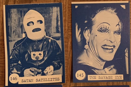 The fronts feature what look like photocopies of the Nu-Card Horror Monster green & (mostly) orange series, but instead of black and white photos and titles, the front images are blue on white. (The back design and text are conventional black and white.) The quality typeset titles on the front of the Horror Monster cards are replaced with white strips that have new titles typed in ALL CAPITAL LETTERS with a typewriter using a bad ink ribbon. Not all of them are actually “new” titles. Although they are usually the same titles as the Horror Monster cards, some are replaced with a gag or funnier quote.