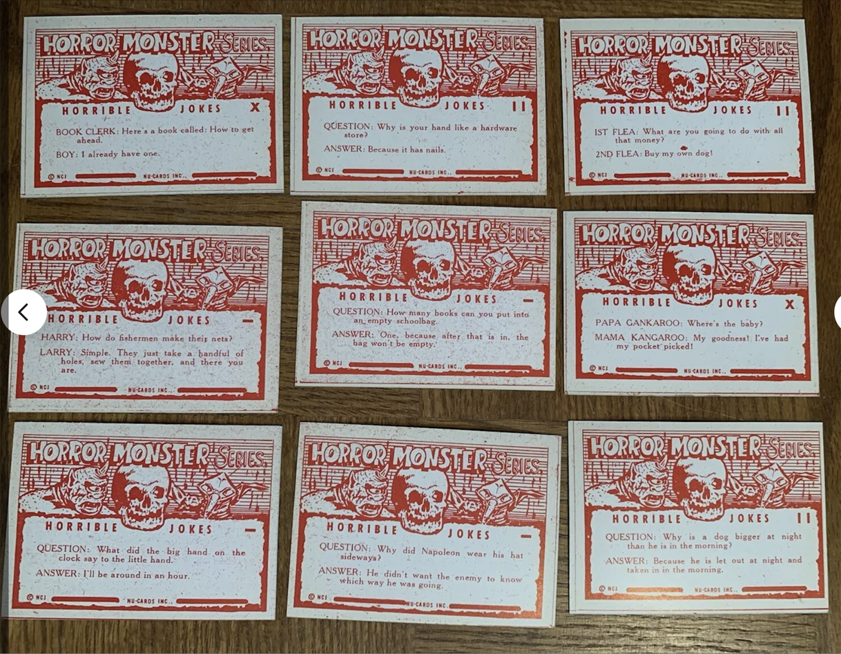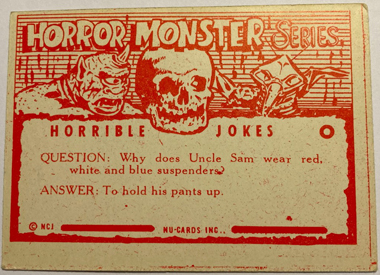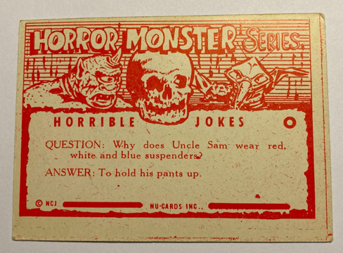 But first, a little background. Most every monster card collector has seen the common blue Monster Cards. They have no known wrapper, no copyright, and no date listed on the cards, but they are generally accepted as being produced by Rosan in 1965 or 66 and sold as complete sets (probably out of the back of Famous Monsters magazine or comic books). A complete set of 84 NM cards were only $200 a decade ago when I bought mine in The Wrapper magazine. The backs have a primitive Halloween style design that looks like a 5th grader drew it. Below the “Monster Cards” title are crude images of a ghost, a skull wearing a hat, a Cyclops, and a spider hovering above a stretched out rattle snake, followed by "Terrible Jokes:” A typical example is #81…