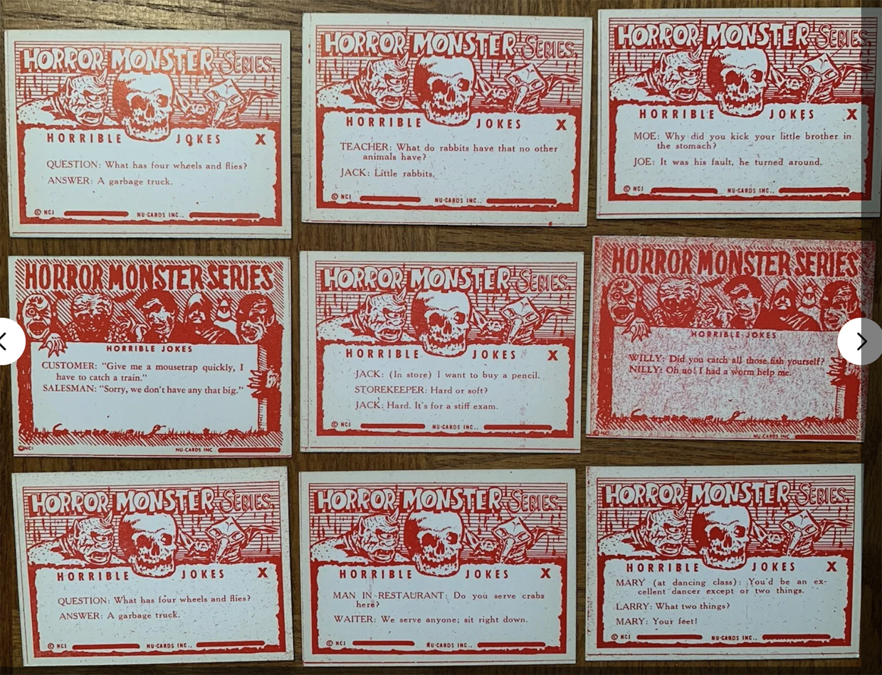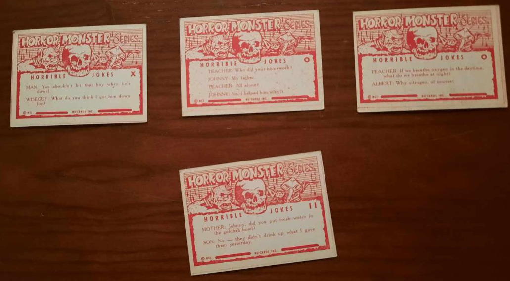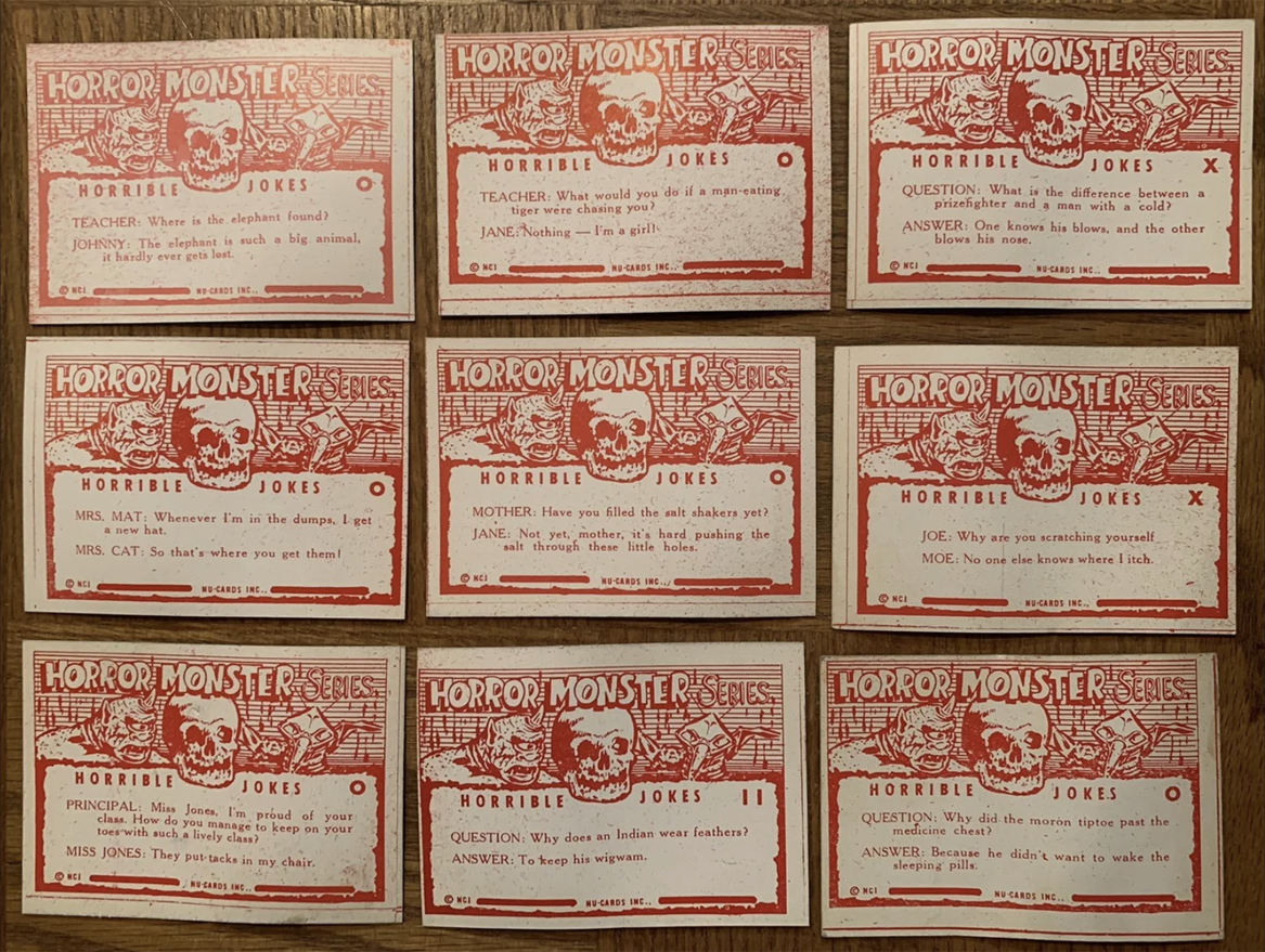 “Why do you assume they needed 84 cards?” you ask, “That’s an odd number for a set.” I agree, it is. But guess what other monster set has exactly 84 cards? The aforementioned blue Monster Cards by Rosan. And wouldn’t you know, both series use the same photos and also the same typewriter font to type-in their titles. The eBay lot is just one card shy of 84 (assuming all the missing cards from 64 to 146 exist). And get this: All 84 of the blue Monster Cards perfectly correspond to the Horror Monster Blue eBay lot. We’re missing 30, but I’m confident when they surface, they will likewise mirror the blue Monster Card series. Even the jokes match card for card (although retyped for the new back design).