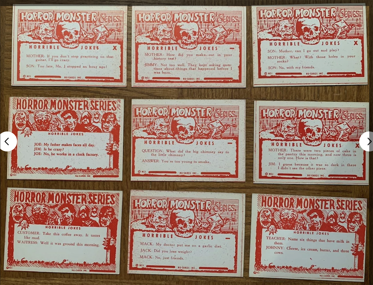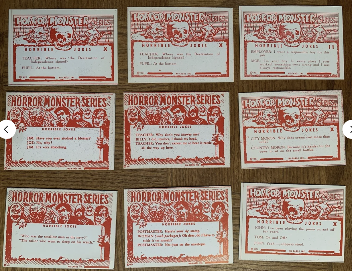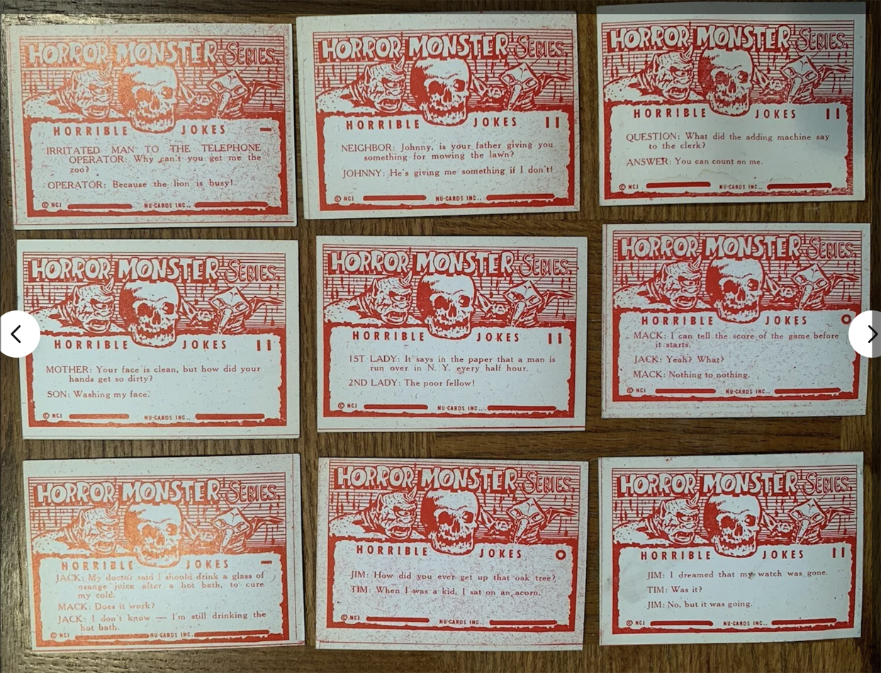 “Why do you assume they needed 84 cards?” you ask, “That’s an odd number for a set.” I agree, it is. But guess what other monster set has exactly 84 cards? The aforementioned blue Monster Cards by Rosan. And wouldn’t you know, both series use the same photos and also the same typewriter font to type-in their titles. The eBay lot is just one card shy of 84 (assuming all the missing cards from 64 to 146 exist). And get this: All 84 of the blue Monster Cards perfectly correspond to the Horror Monster Blue eBay lot. We’re missing 30, but I’m confident when they surface, they will likewise mirror the blue Monster Card series. Even the jokes match card for card (although retyped for the new back design).