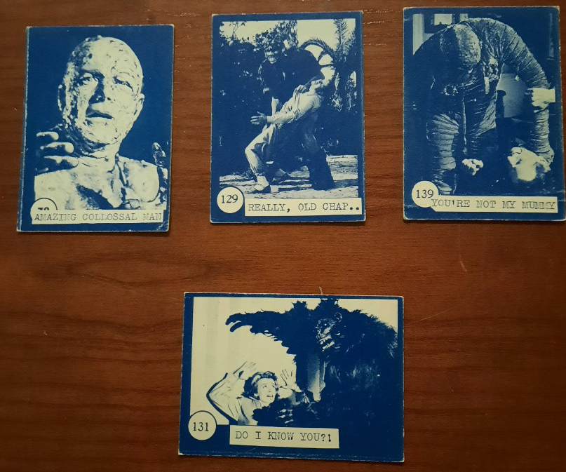 Now that we’ve finally exposed the ugly truth about Horror Monster Blue, don’t assume my feelings about them are negative. I’m not saying they aren’t interesting, or that I don’t like them, or that I don’t collect them. I find them very interesting and I collect them. I don’t consider them worthy of the $30 per card price tag they recently fetched given their pedigree (IMHO), but there is no denying they are scarce. (I only own a few as type cards.) The fact is, it’s hard enough to unearth solid information on vintage cards that were made by established companies in large quantities. Finding information on pirated cards made in small numbers by hustlers trying to avoid detection is almost impossible. But at least the clues for this series are abundant, and although we may not be able to prove 100% who printed them, the evidence is overwhelming that they are not the original or test issue of the Nu-Card sets. They were made afterwards, and all clues point to Rosan. This set was a precursor to the blue Monster Cards, followd by the Terror Monster and Famous Monsters sets.