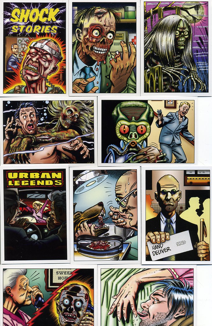 By Kurt Kuersteiner ©2009 Monsterwax Monster Trading Cards for The Wrapper MagazineFor many moons, your editor (Les) has asked me to write an article about publishing cards. He wanted a "behind the scenes" look at the process from a manufacturer's standpoint. The project I wanted to discuss became the most ambitious series Monsterwax has ever made. The only problem was, the set took so long to complete, that over a decade passed before I could write about it! Fortunately, that series is finally finished, and the story of its creation is almost as strange as the horror tales it showcases! For starters, it morphed into two series: Shock Stories and Urban Legends. But let's begin at the beginning...