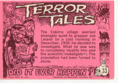 But what really made Terror Tales stand out from all the other monster sets were the backs… Each featured a ghost story or weird “terror tale” in a creative attempt to make the hair on the back of your neck rise. A graphic of a two-headed monster chained to a dungeon wall reading these tales accompanies each story. The Terror Tales title is splashed across the top, while a disclaimer of sorts, “Did it ever happen?” shouts across the bottom.