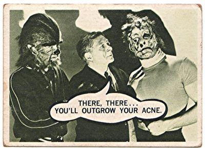 Not only did the kids fail to notice the redundancy, neither did most adults. I’ve had both series for decades, and up until last week, the different graphic fooled me into thinking that the newer series wrote different stories. (Being Topps, I should have known better, huh?) But I take some comfort in seeing that brains much bigger than mine apparently made the same mistake, as none of the catalogs point out that they are the same recycled tales from 1967. Once I noticed they were identical stories, I did the math and quickly realized there were at least two more stories in the 90 card Fright Flicks series… but which ones? I had to take out both sets and cross-reference them to find out. I discovered there was more to it than just two stories.
