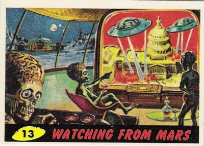 The best place to begin such a journey is at the beginning, so let’s start with the title on the box and wrappers: Mars Attacks. You don’t have to be an English major to know that Mars never attacked anything, it was the Martians who caused all the mischief. The original title for the series, Attack From Space would have likewise been misleading, since the Martians were from Mars and not from the cold void of space. Martians Attack or Attack From Mars would work, but that didn’t sound as sexy. But these are linguistic details, like pointing out the stars were not fighting in Star Wars, so lets move on.