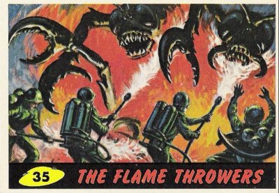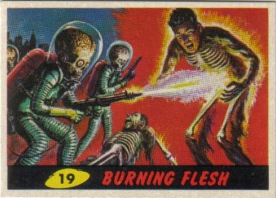 #19, Burning Flesh. This is a great and graphic card. A youth—not a soldier—gets instantly cooked at point blank range by a brain bulging Martian. The youth stares in shock as he watches his flesh evaporate from his chest and legs, revealing his complete inner-bone structure. Remember those “Visible Man” models kits we built as kids? Same thing, only add the sound and smell of bacon frying. What a way to go! My only issue is with the text. It says, “A group of young men banded together in a plot to cut the oxygen lines on the Martian spacesuits.” This begs the question: if the Martians breathe oxygen, how will cutting their lines hurt them when they are on Earth? If anything, it would improve their air supply, as long as they’re not under water. Interestingly, the Mars Attacks movie has them breathe nitrogen, which they can also administer to themselves by chewing a special gum (probably made by Topps). But the cards only mention oxygen.