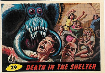 Another bug problem is what color is their blood? Card #31, The Monster Reaches In, show’s an insect’s blood as red, but #38, Victims of the Bug, shows it as being white. The only insects I ever saw with red blood were the ones I swatted after they sucked my red stuff out. Then, of course, there’s those big gray ticks found on dogs, which had the worst colored blood of all (black)!