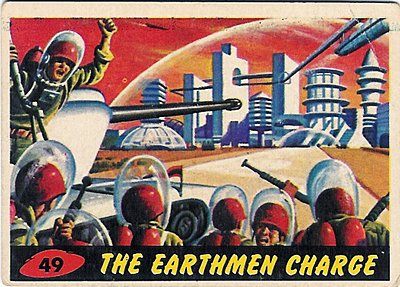 Perhaps the funniest goof in the entire series is seen in card # 49, The Earthmen Charge. This image shows a group of soldiers approaching the Martian city to attack. Yet they are wearing their army hard hats inside their glass air helmets. So in other words, in order for the hard hat to offer any protection at all, the bullet must first shatter the space helmet! That design must have been approved by our government’s most famous oxymoronic agency, the so-called Army Intelligence.
